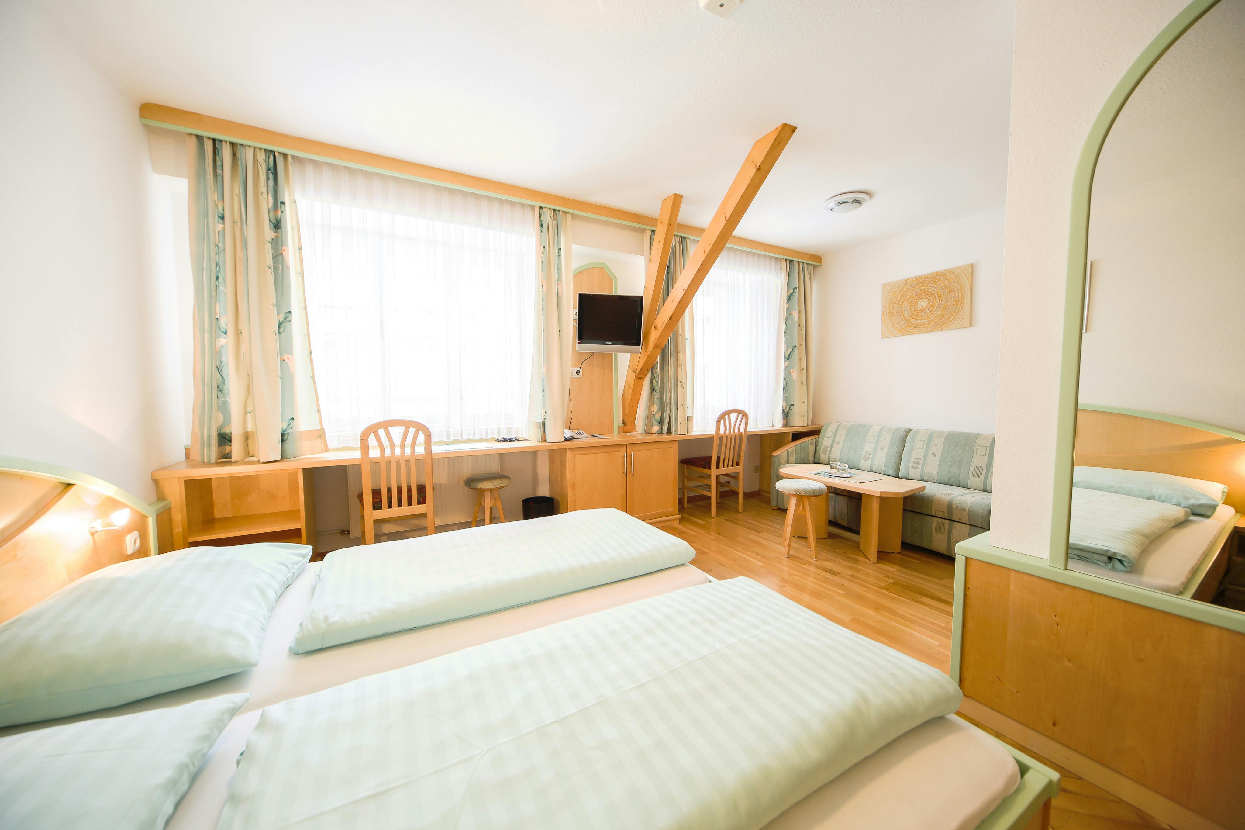 Experience additional comfort in our Double Room Plus, offering 28 m² of space for relaxation. The tasteful decor and modern amenities create a pleasant atmosphere, providing both coziness and style. Some rooms feature a private balcony, where you can enjoy the fresh mountain air and the picturesque surroundings.